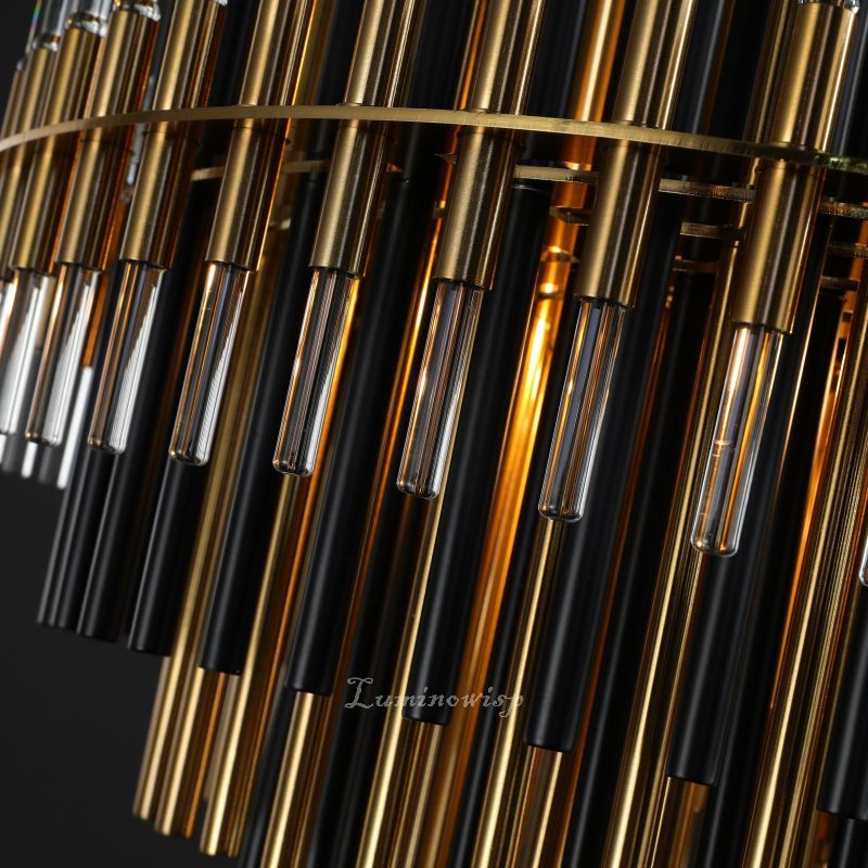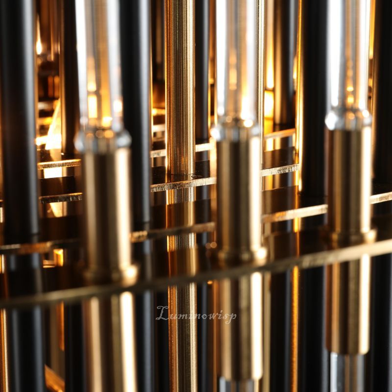 The chandelier series, crafted with ascending and descending concentric spikes, shapes the sconce's outline, featuring numerous tiers of graduated metal and acrylic rods that filter the light within, imparting a sculptural essence to the piece.