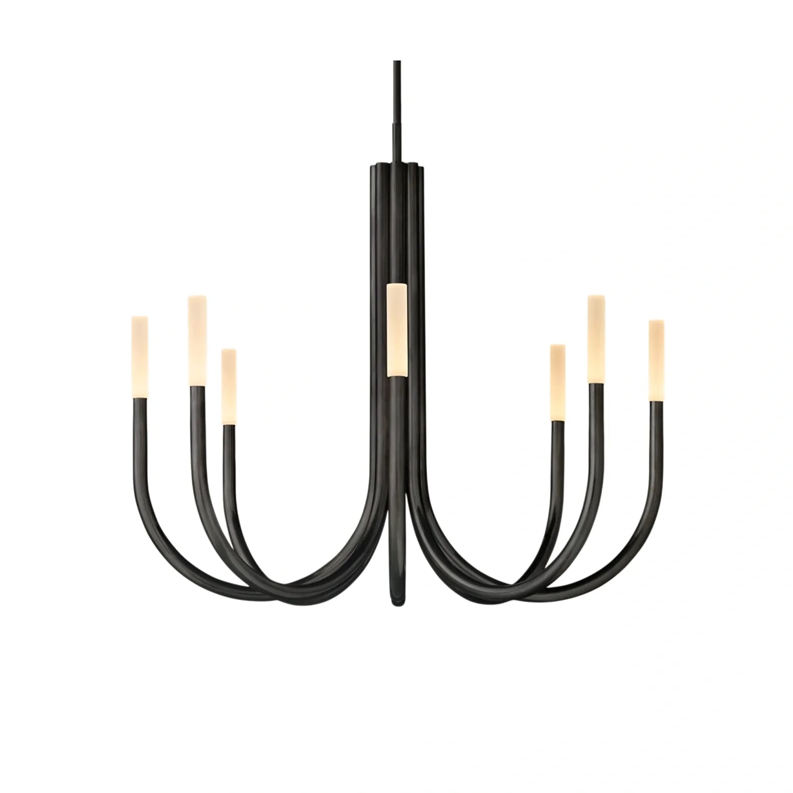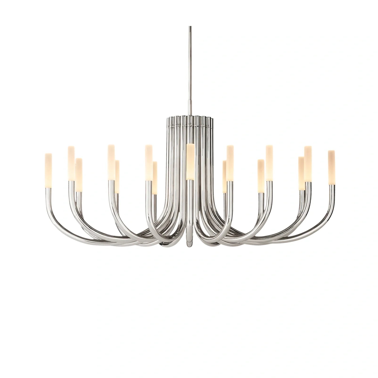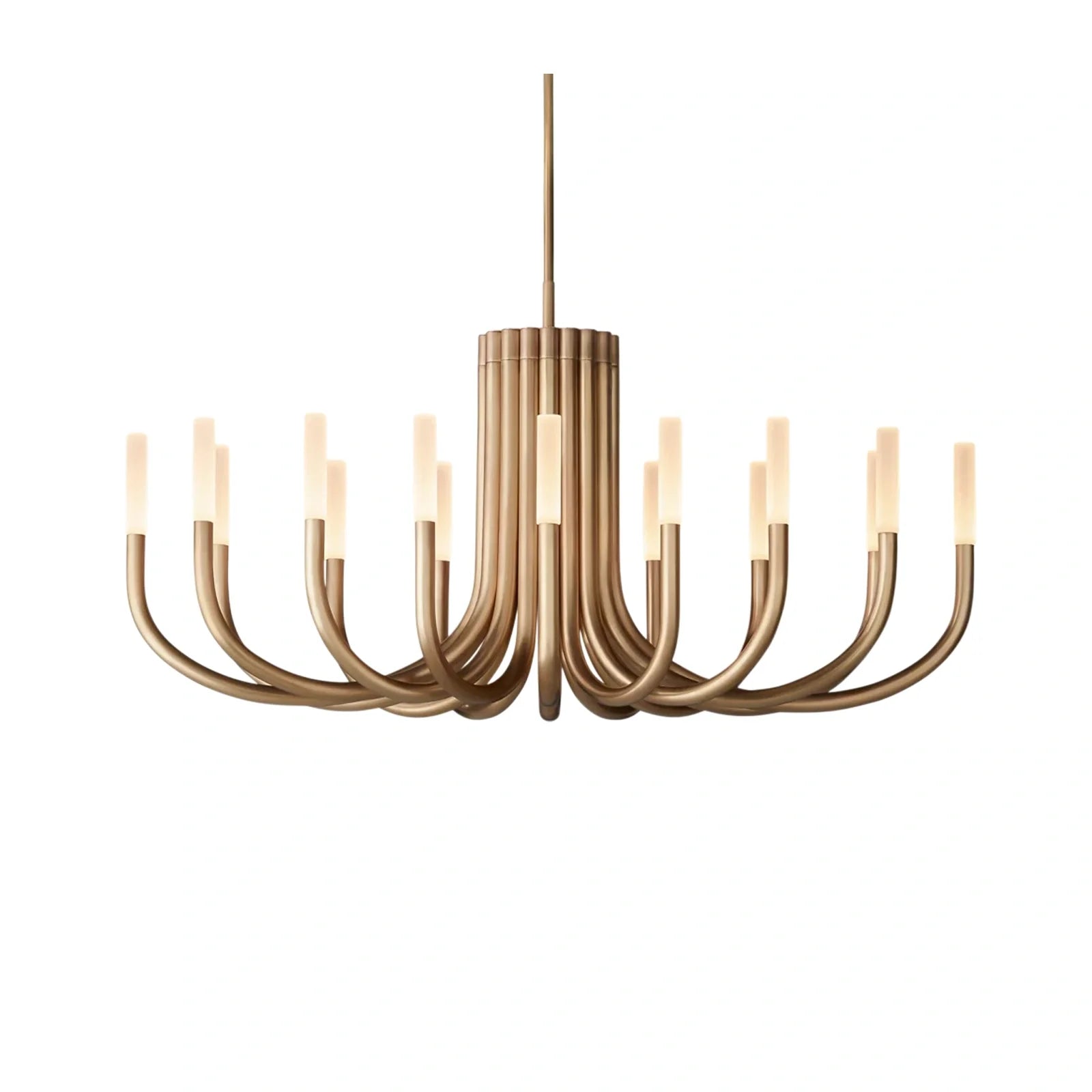 Inspired by mid-century Italian minimalism, the Rousseaw pendant lamp is a modern interpretation of simple shapes and bold silhouettes. Its elegant, soaring arms hold up an etched glass shade that houses an embedded LED bulb, emitting a warm, filtered glow when lit, a pared-back statement of style.
